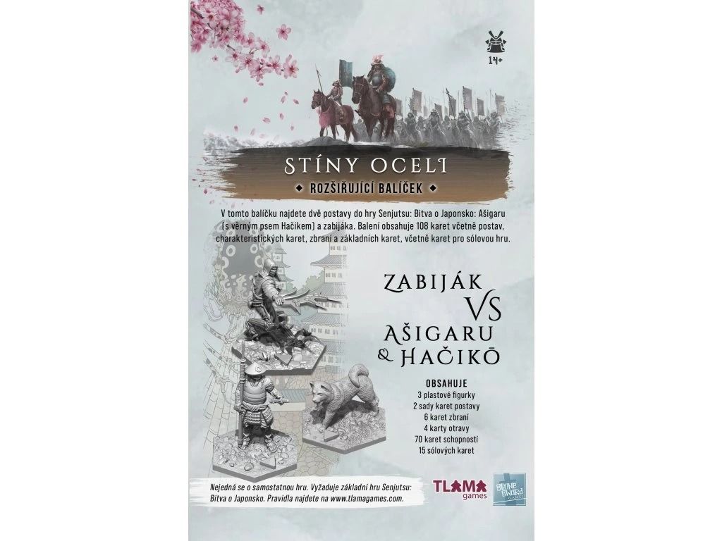 Stíny oceli je rozšírenie akčnej samurajskej bojovky Senjutsu: Bitva o Japonsko. Nájdete v ňom dve nové postavy: Ašigaru (tiež miniatúru jeho verného psa Hačika) a zabijaka. Okrem nich je tu 108 kariet rozširujúcich každý aspekt hry.